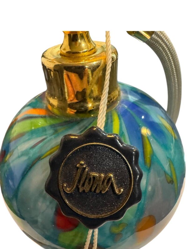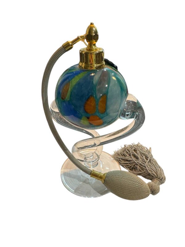 It is a refillable perfume bottle with a bulb atomizer. - The glass is hand-blown with a unique pattern of blues, greens, and browns.